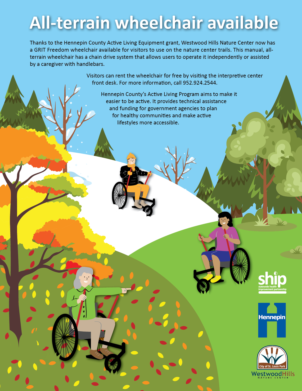 Westwood Hills Nature Center (WHNC) acquired a Grit All-Terrain Wheelchair, a really cool resource that lets people in wheelchairs navigate the outdoors with much greater freedom in all seasons. They’re relatively expensive though so WHNC was excited to let the public know its available and free to use. The availability would be announced via social media, an event at St. Louis Park City Hall, and with flyers at the WHNC visitors center.